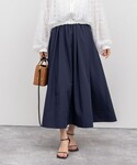 セットアップでもお召しいただける ブラウスとスカートです。 ・ブラウス ブラウスはワンサイズ展開。肩にタックがはいっているので、大きくは感じませんでした。 袖は5分袖までしっかりあるので、羽織いらずで一枚で着やすいです。着丈もヒップにかかるくらい長さがあるので、インせずそのまま 出してパンツやデニムスタイルで合わせても素敵です。 きれいめにもカジュアルにも使いやすいです! ・スカート タックとギャザーがたっぷり入ったスカートです。ウエストは後ろ側はゴムですが、少しぴったりしました。着丈はちょうど足首が見えるほどです。素材もしっかりしており、透けなども気になりません。こちらもお仕事にも、Tシャツなどでカジュアル合わせでも使いやすいです。