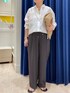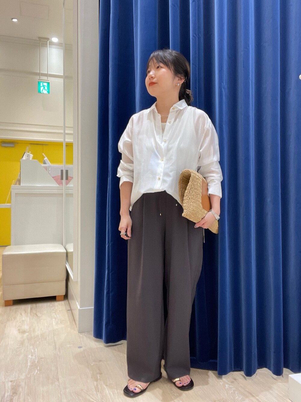 お仕事でもデイリーでも使える アイテムのご紹介です。 ・シアーローンブラウス 裾にボタンホールがあり、裏側にボタンがついています。前をインしてる雰囲気で合わせれるアイテムです。長袖ですが、シアー感が可愛く 今からの時期のお羽織にも合わせやすくなっています。ゆとりをもたしてきたかったので、38サイズを着用しています。 ・ツイルイージーパンツ 36サイズを着用。すっきりとしたワイドパンツです。柔らかい素材感・ウエストゴムでストレスフリー。着丈もギリギリつかないくらいの丈でお直しなしでも履いていただけます。 とても楽に履けるので、ご旅行などにもおすすめのパンツです