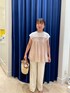 涼しく着れるおすすめトップスです。 カットソー素材とドッキングされた トップス。割繊素材の部分はギャザーが たくさん入っていて、 ふわっとしたシルエットがとても可愛いです。 袖もフレンチスリーブほどあるので 羽織がなくても一枚でお召しいただけます。 パンツは今回34サイズを着用しました。 普段36サイズを履いています。 こちらのパンツは34サイズでもゆとりがあり ちょうどよかったです。ただ、脱ぎ着は 36サイズの方が楽にできました。