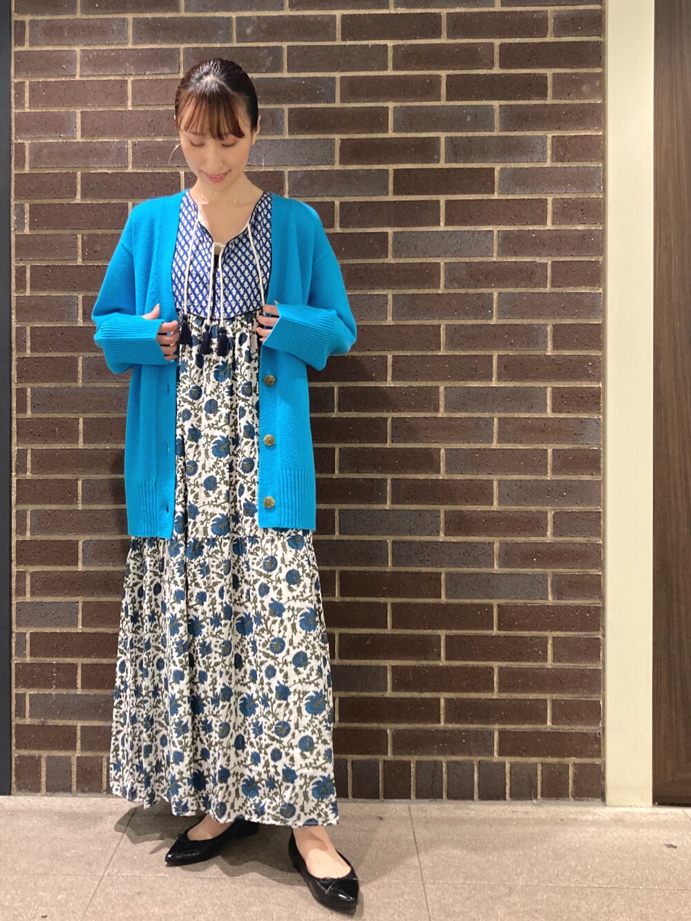インド柄がかわいいコットンワンピースです。 ニットを羽織ってまだまだ長く着用できるので、おすすめです! 鮮やかなブルーのニットカーデも、ブルー系コーデですっきりまとめると派手すぎずかわいいです。