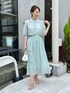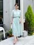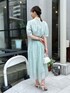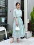 夏におすすめの、シアー素材のセットアップスタイルのご紹介。 シアー感のあるソフトなオーガンジー素材を使ったセットアップです。 程よい光沢があり、柔らかい素材感が女性らしいです。 ブラウスは、前後両前着用可能ですが、今回はボタンを前にしてポイントを持ってきました。 肘くらいまでの袖丈で、羽織いらずのブラウスです。 スカートは、同素材の透け感のある軽やかなスカートです。 ウエスト周りのギャザーでふんわりとしていながら、軽やかな素材感でボリュームが出すぎないのがポイントです。 涼しげなミントグリーンのセットアップで、爽やかな上品スタイルに仕上げました。