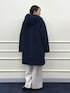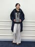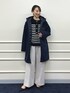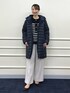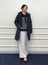 大人気【TAION/タイオン】別注ボア×ダウンフードコートを使ったコーディネートのご紹介。 ダウンは、ボアとキルティングのリバーシブル仕様です。 着用カラーは今年の新色、ボアの面がネイビーでキルティングの面がブラックのすっきりとした大人カラーです。 ワイドパンツと合わせてもバランスの取れる、長すぎない着丈です。 カジュアルな印象の強いボアアウターも、ネイビーなら上品な女性らしさがあります。 パンツはWEB限定、ウォッシャブルウーレットソフトピンタックワイドパンツ。 ウールライクな暖かみがあるワイドパンツです。 センターにピンタックが入っているので、美脚見えのきれいめなシルエットです。 きれい見えするのに、ストレッチ性があり着心地抜群です! メタルボタンがポイントのボーダーニットは、カシミヤ混のラムズウール使用し、大人顔のニットです。 カジュアルになりがちなタイオンのダウンを、モノトーンコーデとヒールを合わせて、大人カジュアルスタイルに仕上げました。