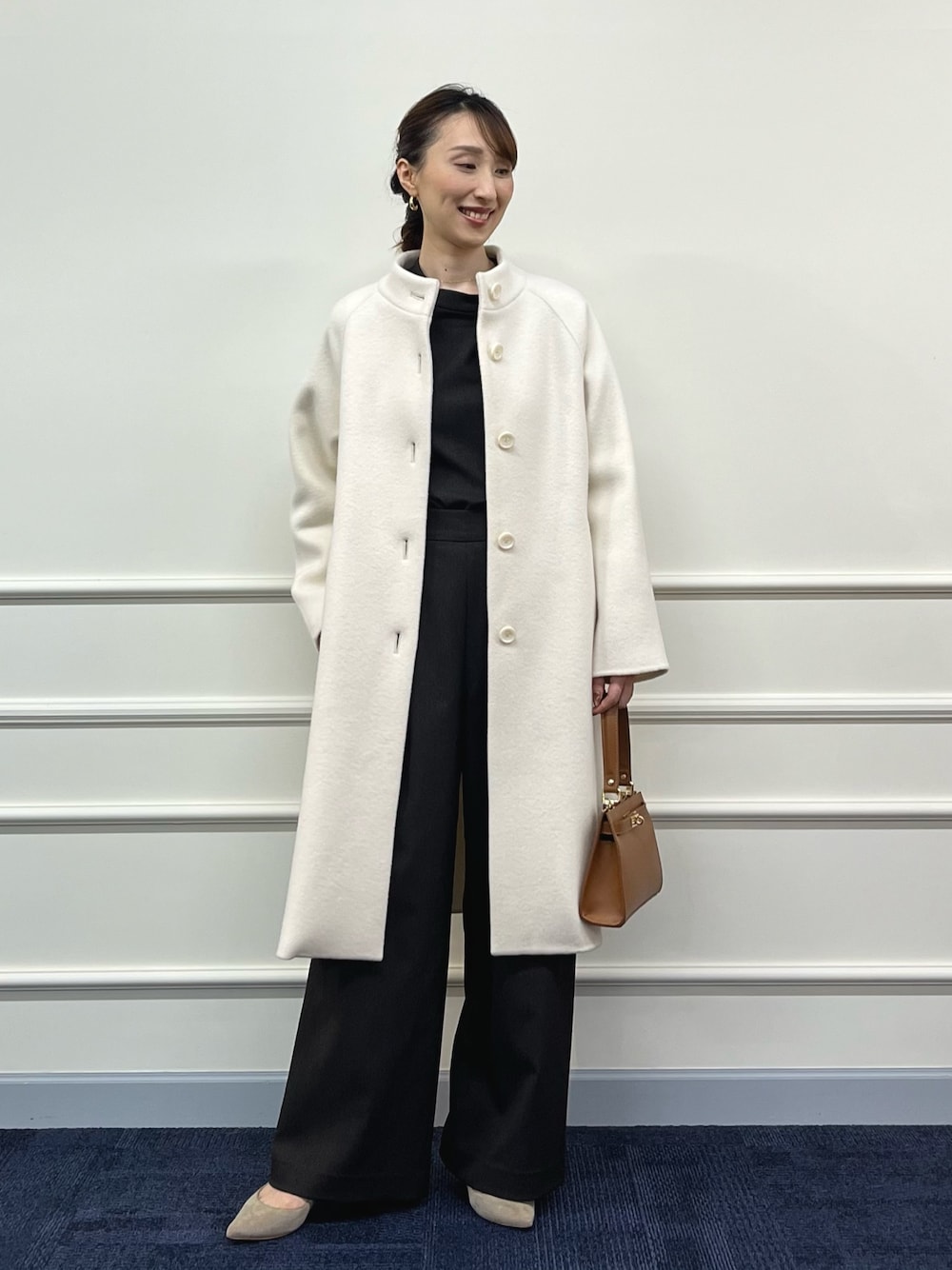 早くもセールになったアウターを使ったコーディネートのご紹介。 アウターは、スタンドカラーと大きめのボタンがポイントのウールコート。 毛90%・ナイロン10%の暖かい素材です。 なめらかな質感の上質ウールを使用しているので、大人な雰囲気です。 マフラー無しでも首元まで暖かいスタンドネックで、オシャレなデザインになっています。 コートの中は、毎年定番人気のウールライクシリーズからパンツのセットアップです。 きちんと見えするのにシワになりにくく、ウォッシャブルのイージーケアで、あると便利なアイテムです。 パンツセットアップに上質なウールコートを羽織って、上品なコーディネートに仕上げました。