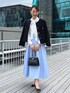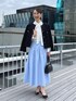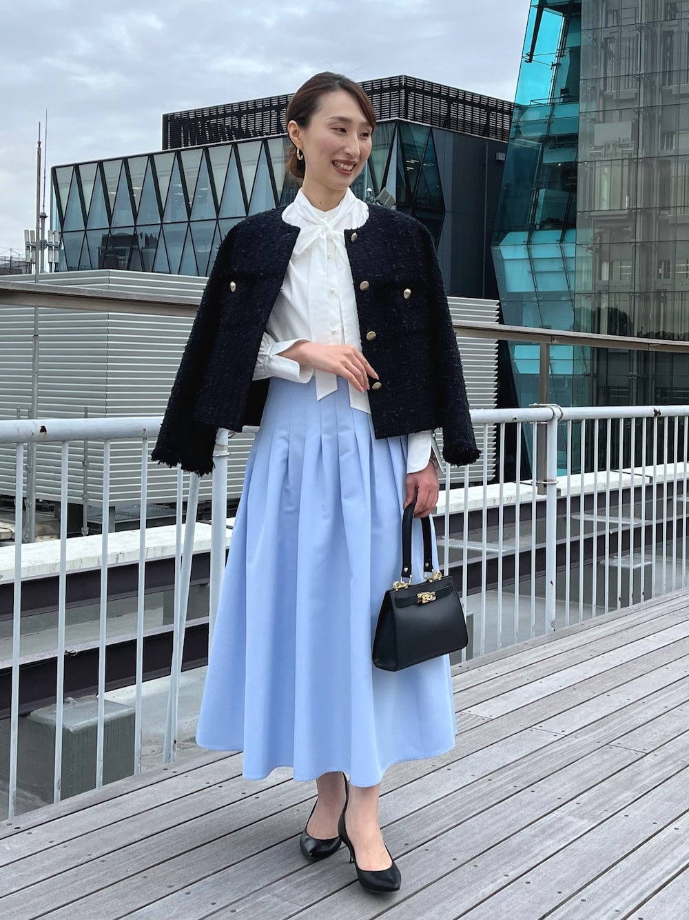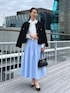 ツイードジャケットを使ったおすすめコーデのご紹介。 ジャケットは、コンパクトな丈感でスカートとも相性抜群。 羽のようなフラッグヤーンとゴールドのメタルボタンがポイントの高級感あるデザインです。 着用のネイビーはラメなしで落ち着いた雰囲気になっています。 スカートは、定番のタックフレアスカート。 シルエットは定番人気のウエストが細見えするフィット&フレアーですが、シャンタングログラン素材を使用した点が新しくなりました。 中に着たブラウスは、パールボタンとリボンボウタイが華やかなシャツブラウス。 春らしく爽やかなスカートスタイルにツイードジャケットを合わせた、きれいめコーデに仕上げました。