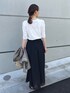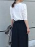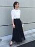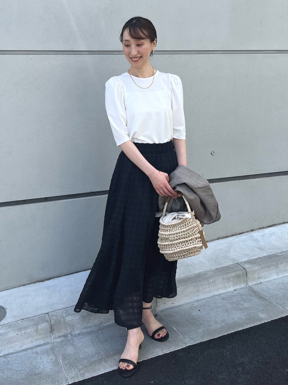 夏におすすめのモノトーンコーデのご紹介。 トップスは、肩にタックの入った5分袖カットソー。 実は接触冷感とUVカット機能付きの夏にぴったりの素材です。 カットソーですが、ツヤのあるきれいめな素材感なので上品な印象です。 スカートは、シアーな素材感のチェックギャザースカート。 サッカー素材のため肌に張り付かない軽やかさがあります。 さりげないチェック柄スカートで、白黒コーデを大人かわいいスタイルに仕上げました。 ------------------------------------ Instagramでは ライブなどで商品紹介しています ▶︎▶︎ @ikeo_nol ◀︎◀︎ ------------------------------------