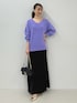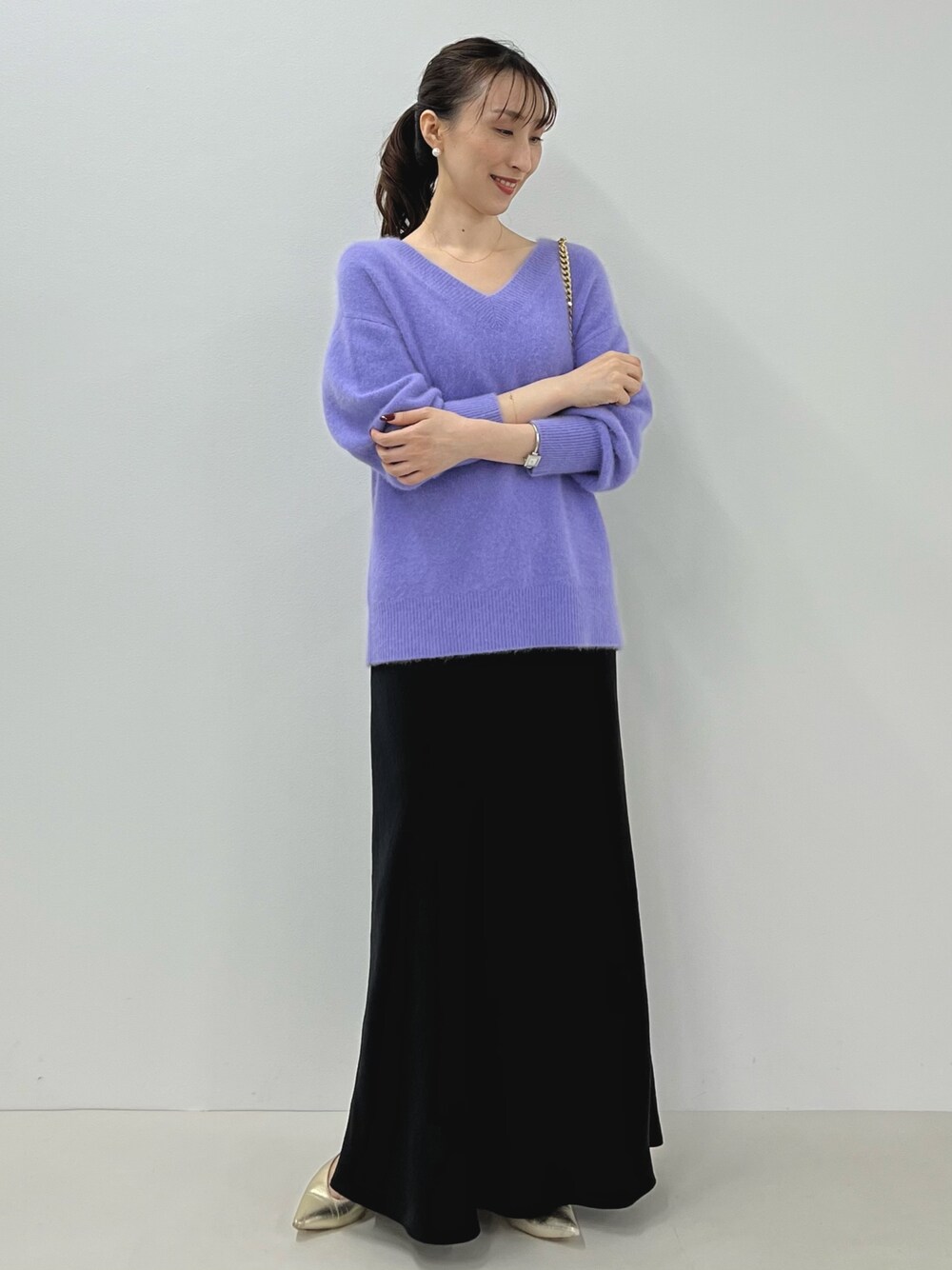 毎年大人気のヘアリーニットを使ったコーディネートのご紹介。 トップスは、Vネックとボートネックの前後2WAY着用可能です。 少しゆったりめのルーズ感がこなれた雰囲気です。 素材はカシミヤが5%入った上質ウールなので、肌触りもふわふわで軽くて暖かいです。 着丈は少しありますが、ロングスカートやワイドパンツ、どんなボトムスで出して着てもバランスが取れる絶妙なサイズ感です。 スカートは、ブライトサテンナロースカート。 ヴィンテージ感のあるサテン生地が大人な雰囲気です。 パープルのニットにブラックのロングスカートを合わせて、大人のカラーコーデに仕上げました。 ------------------------------------ Instagramでは ライブなどで商品紹介しています ▶︎▶︎ @ikeo_nol ◀︎◀︎ ------------------------------------