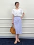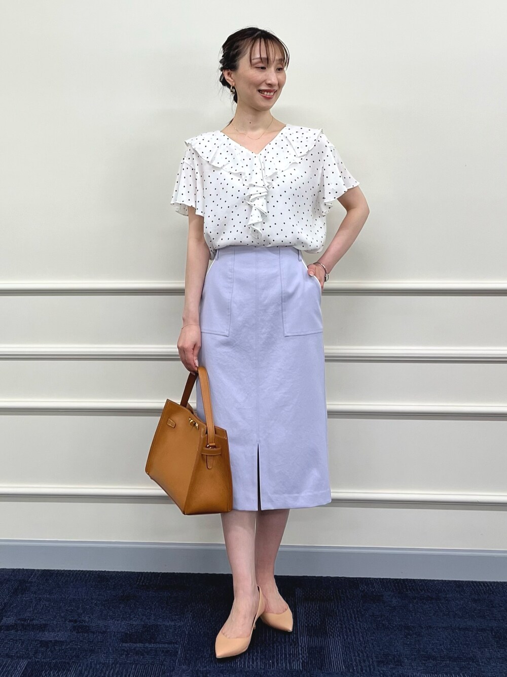 おすすめアイテムを使ったコーディネートのご紹介。 トップスは、春も人気だったフリルブラウスの半袖バージョン。 顔周りが華やぐフリルのデザインが着映えする事間違いなしです! ドットは細かい柄なので、すっきりと大人っぽい雰囲気で、Vネックで甘さが抑えられるのがポイントです。 ボトムスは、夏の定番素材のタイトスカート。 綿麻混でドライタッチな涼しいスカートです。 ポケットの縁のパイピングがさりげなくアクセントになります。 バックウエストはゴム仕様ですが、前はすっきりとしたウエストデザインです。 ドット柄の着映えブラウスを使った、夏のきれいめコーデに仕上げました。 ------------------------------------ Instagramでは ライブなどで商品紹介しています ▶︎▶︎ @ikeo_nol ◀︎◀︎ ------------------------------------