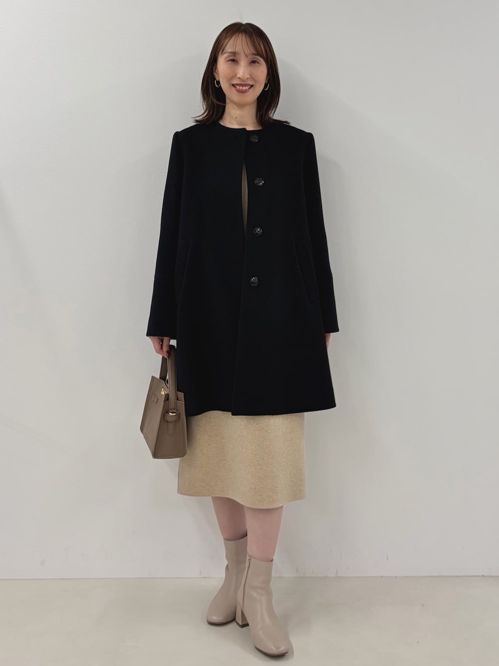 nol ikeo(ノーリーズ日本橋店)のノーカラーコート「ブローチ付きAラインノーカラーコート」を使ったコーディネート