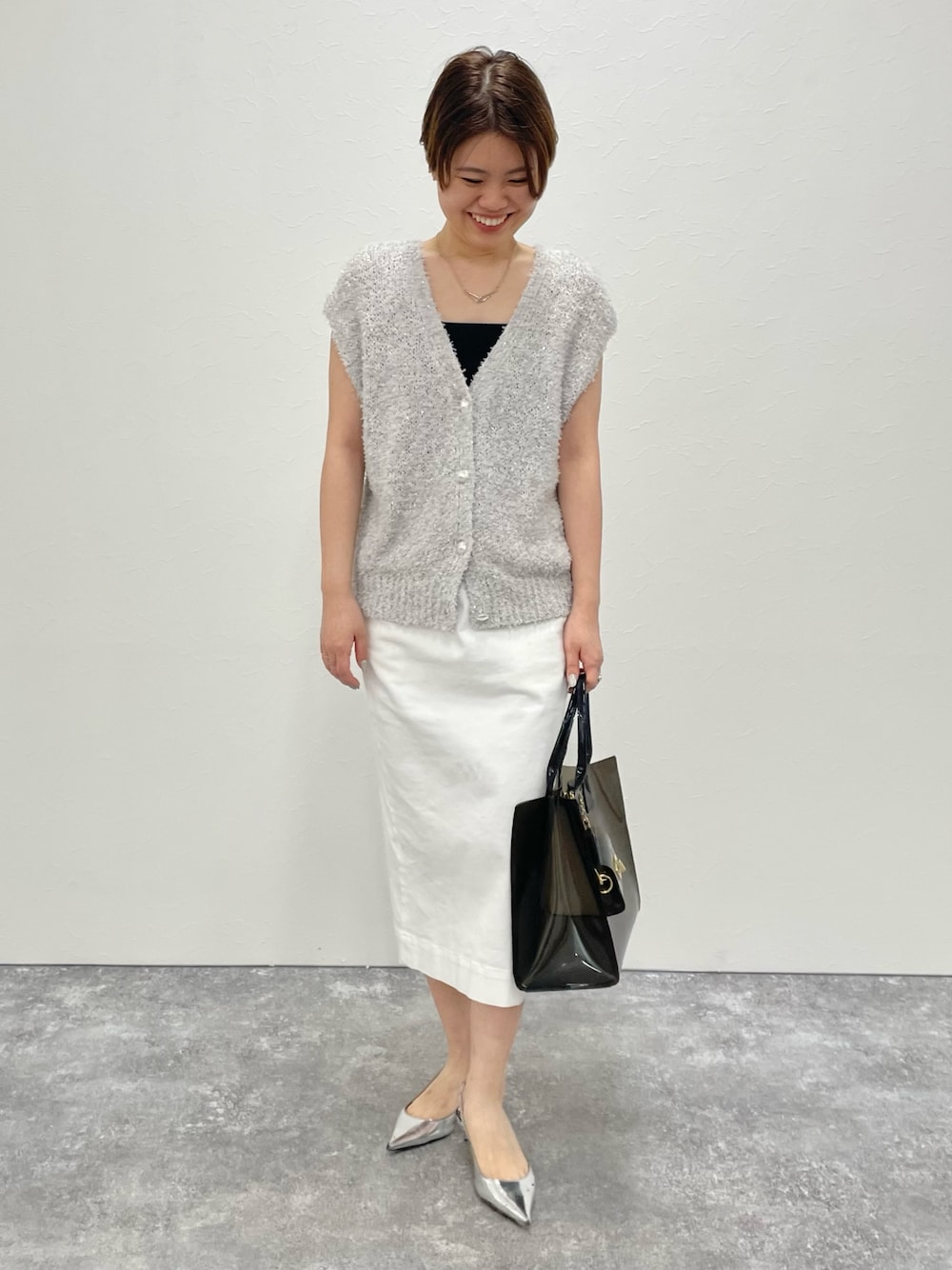 デニムスカートをきれいめに… 爽やかなホワイトはこれからの季節にぴったりです🤍 バックスリットで足捌きも良く! ニットベストはインナーの上から一枚で着ても、薄手のニットやカットソーをレイヤードすれば肌寒い時期から着られます。 アウターの中にチラッと見せるスタイルも可愛いですよ! 全体的にホワイトっぽくまとめたところに、インナーとバッグで締め色を入れてみました。