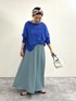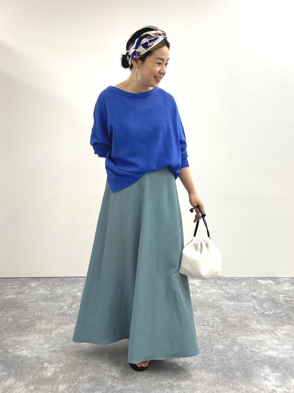 大人カジュアルリラックスコーディネート。 涼しさを感じる麻混のニットに、 リラックス感のある大人ロングフレアスカートを 合わせました。 あえてブルー×ブルーにして、 スカーフをダーバン使いに。 爽やかさと、こなれ感をだしました。 ニットはゆったりシルエットなので、 パンツスタイルの方にもおすすめ。 スカートは少し肉感のある微光沢素材で、 冬から春まで長く使えるアイテムです。