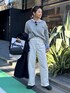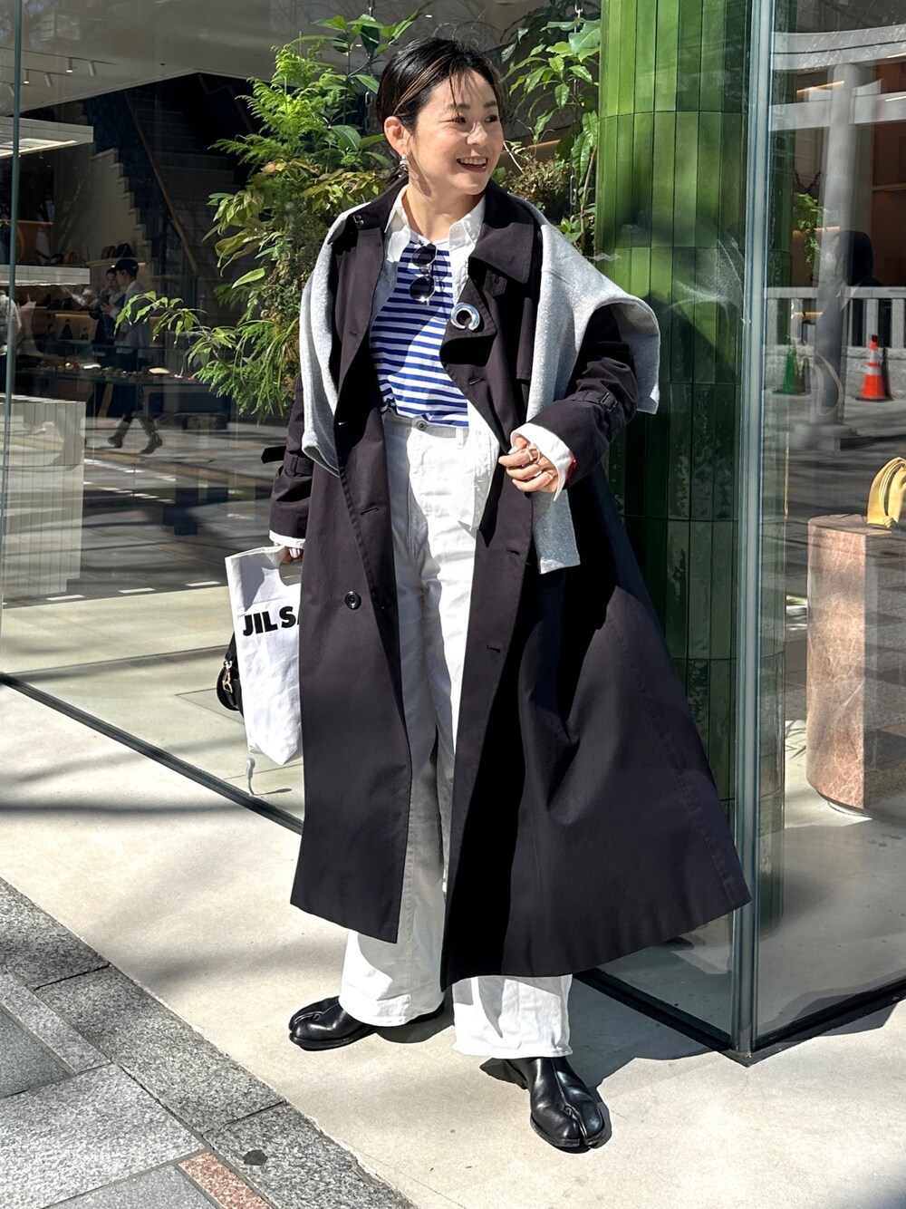 春アウターコーデ 風がすごく強かったけど、雨続きから晴れて☀️ 爽やかだった日 NMPのダークネイビーのトレンチに、 ボーダーに白デニムで、マリンな雰囲気に。 コートはユニセックス。 長くきていただけるアイテムです。 サイズMを着ています。 リエミラーの新作ショートシャツと、 ゆるっと着れるラメスエットと合わせていました。
