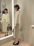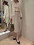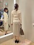 トップスのニットはカシミヤ、シルク混の素材で柔らかい肌触りです。 リブニットですが体のラインが出にくいシルエットになっております。 アンサンブルで着ていただけますが、単品でも着用できます。 プルオーバーはUネックで、首が詰まっているのが苦手な方でも着やすい、少し深めになっております。 ジャケットインナーにもおすすめです。 スカートはベルト付き! スリット位置も真ん中ではなく、左側にあります。 少しデザインの入ったラップ風スカートです。 丈感も膝下で、スッキリきれい目! 王道通勤服で流行りにとらわれず長く愛用できるシンプルさがポイントです!