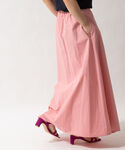 色がとてもかわいいスカート カジュアルにロゴTシャツ合わせ 長さがしっかりあるのでペタンコシューズと合わせても好バランス