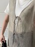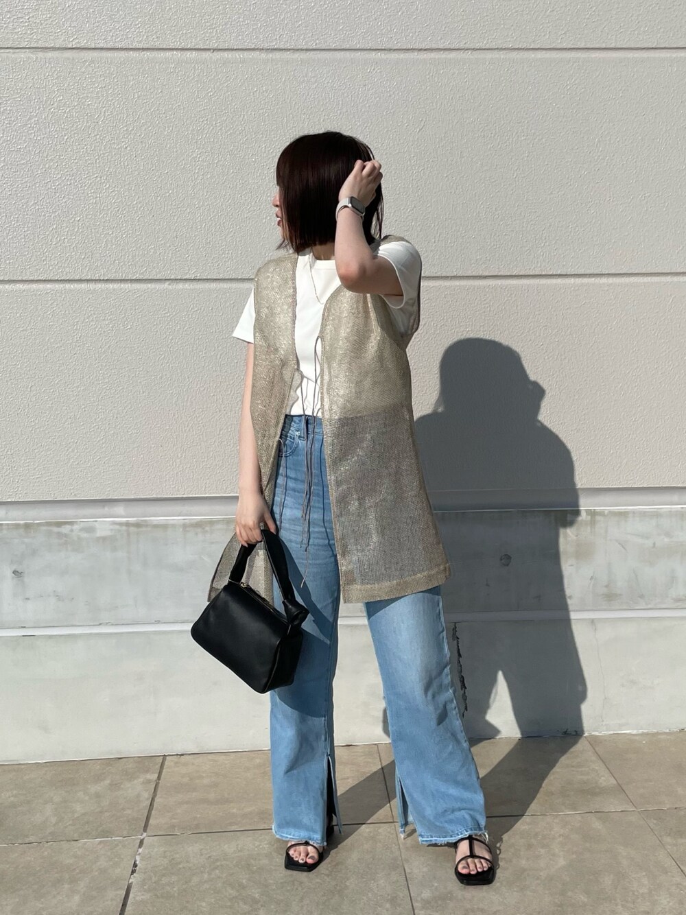 デニムに白のTシャツは夏の定番で可愛い! でもちょっといつもと違う感じにしたい!という時におすすめアイテムを発見しました✨ それがこの"サビラメジレ" ギラつかず落ち着いたラメ感が上品なサビラメを使用しているので、光に当たると綺麗な印象を与えてくれます! 全体写真のようにリボンは結ばず着て頂いても🙆🏻♀️最後の写真のように結んで着て頂いても🙆🏻♀️なアイテムになってます✨ (別投稿で両前で着たもの上げてるのでそちらも是非チェックお願いします🙇🏻♀️) カットソーは、5分袖で着て頂きやすい長さになってます!首元は程よい開きのスクエアネックになっているので、しっかりと首元が見えます✨ 何にでも合わせて頂きやすい便利なアイテムの1つになっています! この夏におすすめアイテムになっているので、是非チェックしてみてください😽