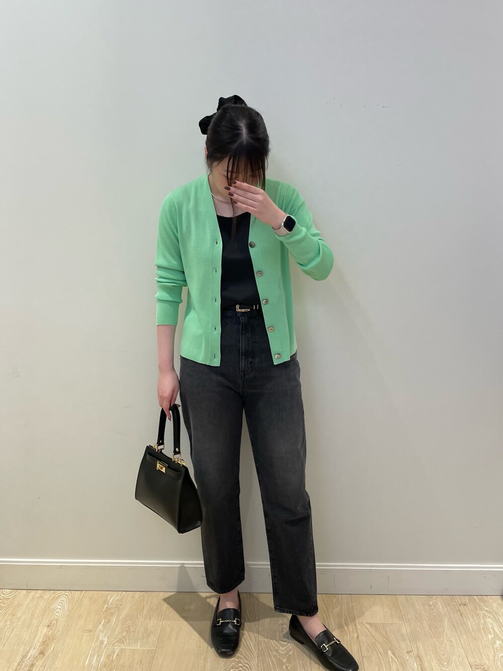春におすすめなカラーを使ったコーデです!! エタニティーVネックカーディガン! 新色登場し入荷しております!! 春カラーにぴったりなグリーンは、ブラックコーデの刺し色に👍🏻 もちろんホワイトコーデなどにも合います!! ウール素材で肉厚過ぎないのでより春先まで長く着て頂けます! ご自宅でのお手入れも可能なのが助かっちゃいますね🏠 デニムはテーパードの形になっています! 細すぎない太さで、細身デニムは…でも細めで履きたい!そういう方にオススメです✨ ハイウエストなので、スタイルアップも叶っちゃいます🍀