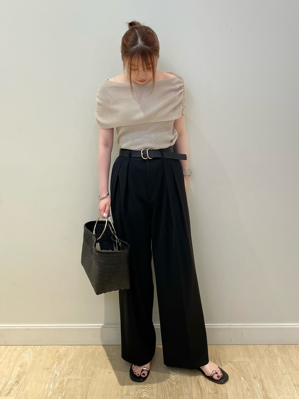 ⦿ニット 麻のようなドライタッチな風合いが特徴で、サラリと着用できる1枚! 幅の広い衿を折り返して少し下げればオフショルダーとして着用可能です🫶🏻 衿の内側両脇に細いゴムをたたき付けており、オフショルにしてもホールド感がある仕様 肩に引っ掛けたままでの着用も◎ 着用している色の他に赤がありそれは…目を引く赤が夏らしくおすすめカラー✊🏻❤️🔥 デニムやワイドパンツ合わせで大人の女性らしい着こなしになります🎐 ⦿パンツ 新色として登場した黒!!🖤 やっぱり落ち着くカラーでどストライク🤫 定番人気のドライタッチのツイル素材を使用したワイドパンツで、超強撚素材になっておりさらっとしたタッチで落ち感のきれいな素材感! 洗濯後もシワになりにくく、アイロン要らずのイージーケアなのはこれからの時期に🙆♀️ 2タックでやや太めのシルエットにし今年らしさアップで、ストンと落ちる素材感のため、ワイドシルエットでもすっきり見えします👀 自然と手に取ってしまいましたが…トレンドカラーのブラウンは、どんなアイテムとも相性良いカラーなので使いやすいです! タックが入っているので、こちらもオンオフ兼用できる汎用性の高い1枚になってます!