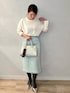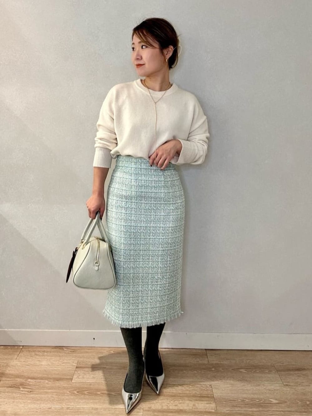 低身長&骨格ストレートが着る オフィスカジュアルコーデ👜 white × mint 冬だからこそ、明るいカラーを🩵 気持ちも明るくなってお仕事もがんばれそう😎 リアルバイしたコットンタイツは、カラーに合うグレーをチョイス! 寒い日も、温かさとオシャレを両立できます🙆