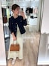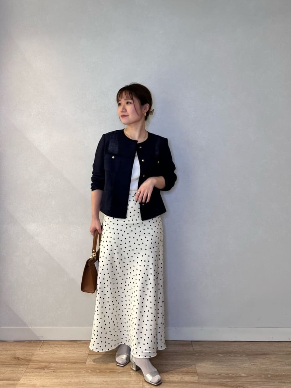 ドット柄のナロースカートで 女性らしくもキレイ目すぎない印象に☺️✨ メッシュジャケットは、 ジャケットと言ってもカーディガンの様に サラッと着れて柔らかい素材感🍃 インナーはタンクトップのみですが お肌の透け感もほとんどありません👍