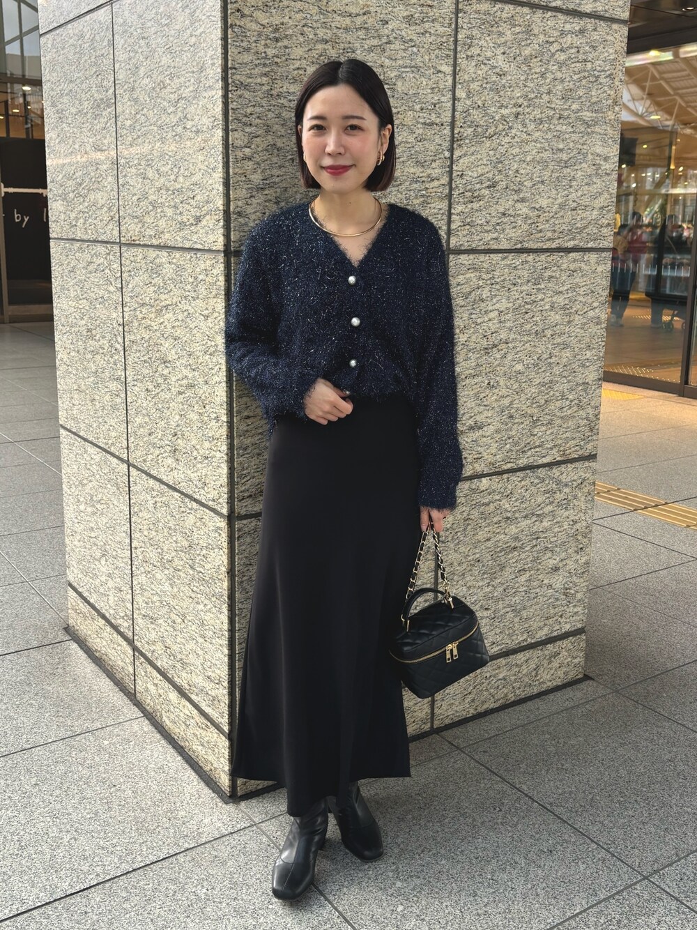 キラキラ&ふわふわがとってもかわいいカーディガン♡ 今の時期はインナーと合わせたり、1枚でプルオーバー風に着ても映えます🙆🏻♀️✨️ パールのボタンもアクセントになり、カジュアルになりすぎません。 ネイビーはよりスッキリした印象に💕 大人気のマットサテンナロースカートは春まで活躍します✨️ ピタッとしすぎず着られるシルエットで細見えします💕