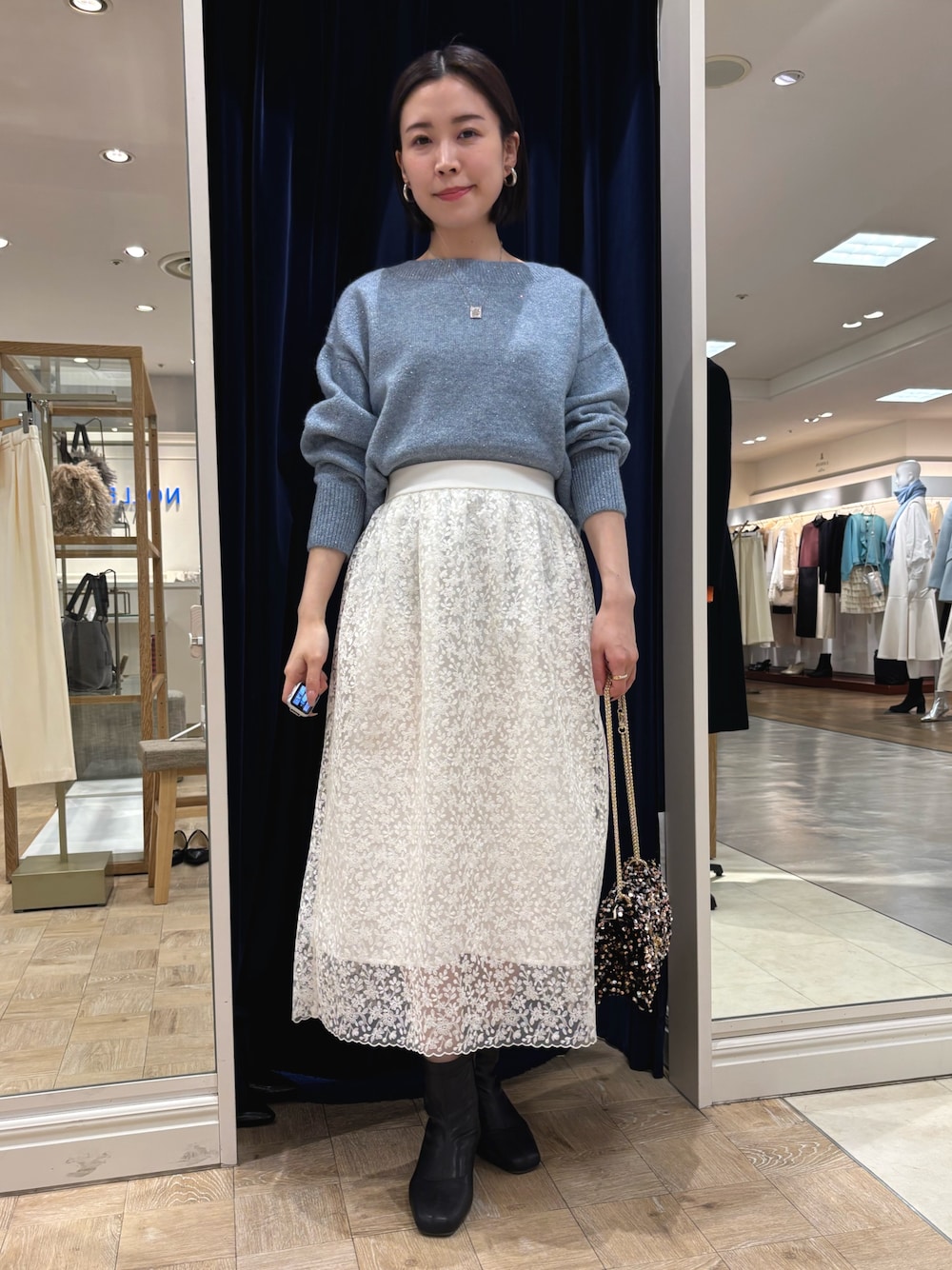 今年も大人気の、スパンコール入りのニット✨️ 動くとキラッとスパンコールが光って、これからのホリデーシーズンにピッタリです。 もっちりとした手触りのニット生地で、暖かく着られます。 スパンコールは固すぎずですが、気になる方はシアーインナーやロンTを合わせるとより気になりにくいです。 両前で丸首、Vネックで着られます💕 細かいレース柄がかわいいスカートは ウエスト部分がゴムで履き心地楽ちんです✨️ フレアですが落ち感があり、ボリュームは出過ぎず広がりすぎないです。 冬はタイツ、ブーツ合わせなど、シーズン問わずに履けます。