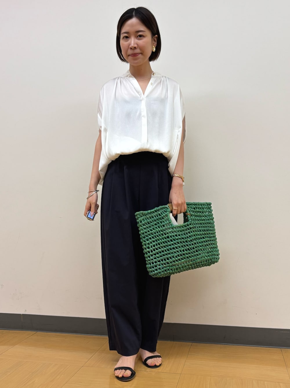 先日販売スタートしたハンマーサテンのケープブラウス✨️ ケープ風なので腕をカバーしながら着られて身体のラインが出ないです❣️ 裾はゴムになっているのでインせずでもほどよくバランスよく着られます。 前開きなので、少し開けて抜け感が出るように着てみました❣️ 撥水シリーズのパンツは 2タックで脚のラインを拾わずスッキリと履けます。 ウエストゴムでストレスフリーです✨️✨️ サラっとした肌ざわりで暑い日にぴったりです✨️