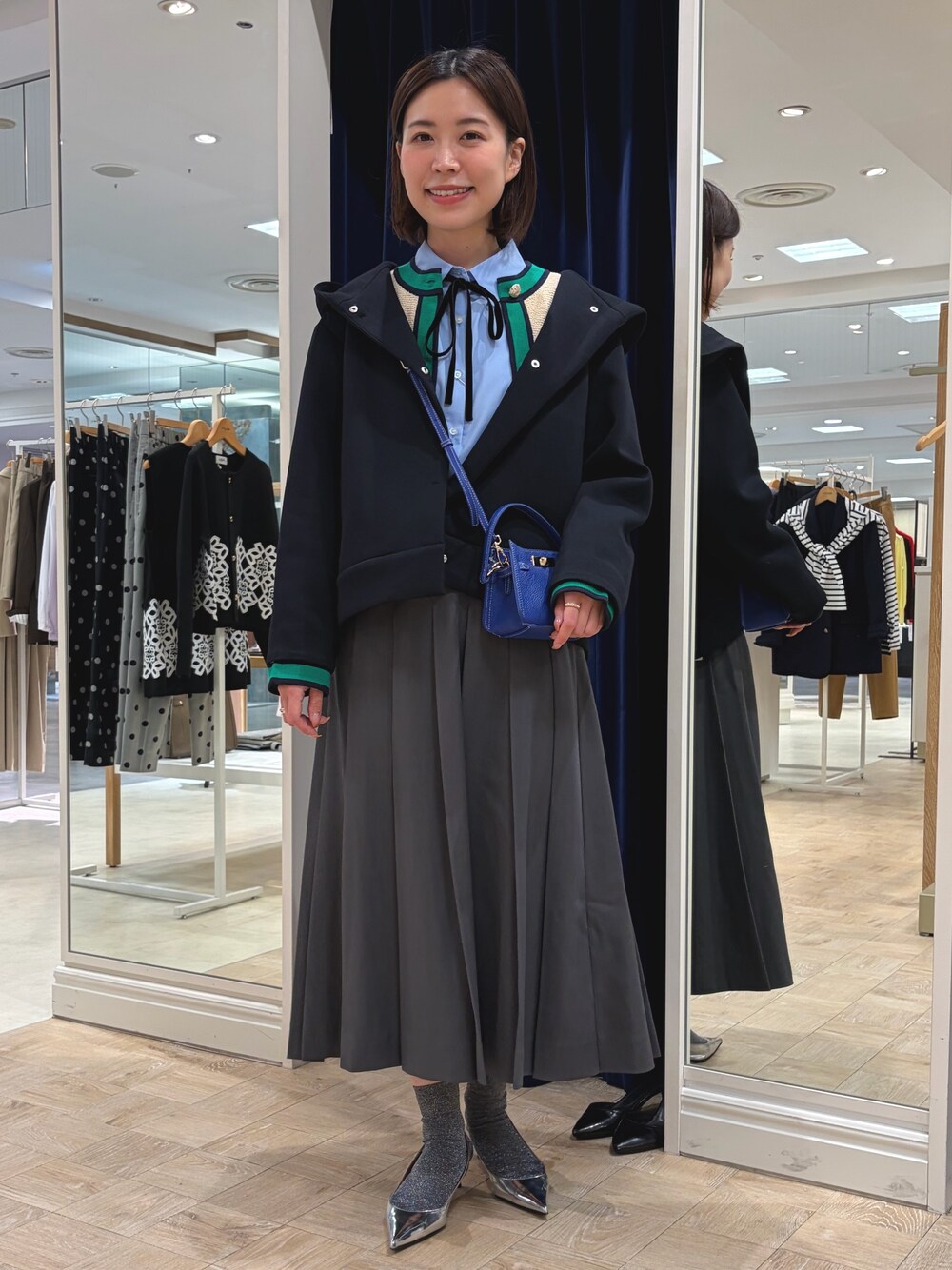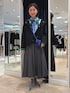 お店でも人気の、毎年定番のエアボールフードブルゾン✨ ダンボール素材でほどよくカジュアルになりすぎず、気軽に着られる羽織です。 ゆとりのあるサイズ感なので、ニットやボリュームのあるブラウスの上にも羽織りやすく 冬はこの上からウールコートも着られるくらいのほどよいスッキリ感のあるシルエットです。 トレンドのプリーツスカートは ふくらはぎまである丈感なので、学生っぽくならずに履けました❣️ ソックス➕ローファーや、ロングブーツ合わせがおすすめです✨