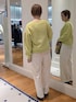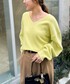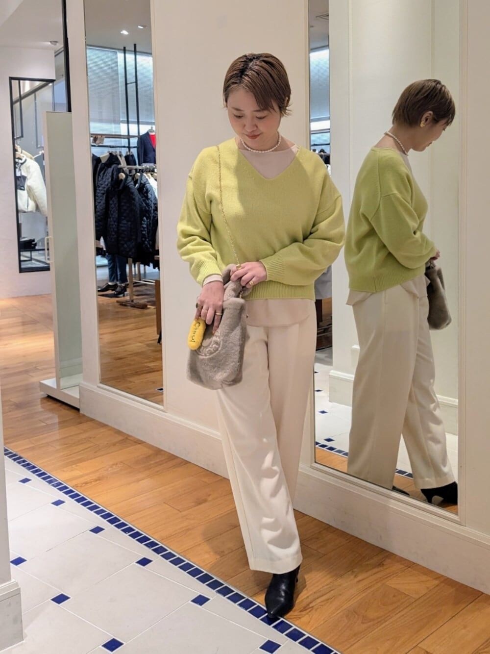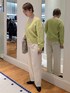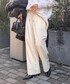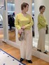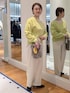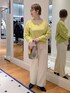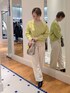 イエロー×ホワイトのカラーコーデ バッグのチャームもイエローにしてリンクしてみました。 ニットはゆとりがあり、前が少し短くなっています。中に着ているサテンのブラウスはこちらのニットと合わせると丈のバランスがちょうどよいです🐼 パンツは裏起毛で暖かく、裾が広がりすぎないデザインで足元がスッキリ見えます。太もも周りはゆったりしていて着やすいです。
