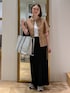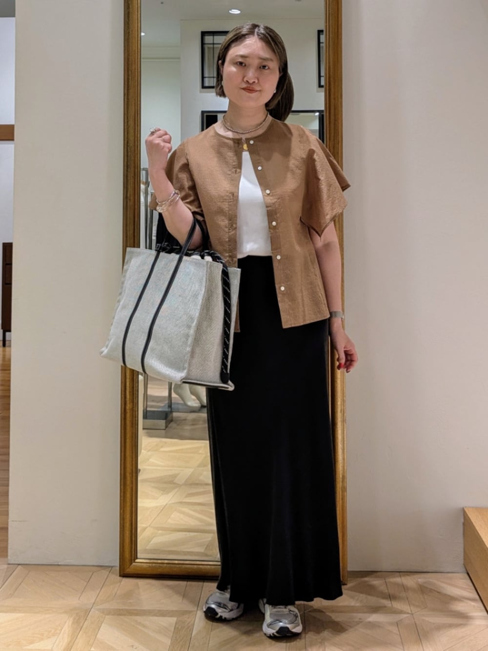 ブラウス…前後着用可能なのでボトムスに合わせて色々着こなしが楽しめます。今回は羽織として着用しました。 薄手で涼しく暑い時期に使いやすいです。二の腕カバーも叶うヒラヒラした袖がポイントです☺️ スカート…ツヤと落ち感が綺麗なスカート。ウエストゴムで履き心地も良いです。長め丈なのでヒール以外にもスニーカーやぺたんこサンダルなどカジュアルな靴とも相性が良いです。