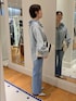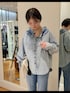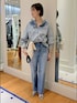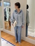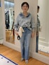 ブラウス⋯リアルバイアイテムです。立体感のある襟のフリルがポイント。フリルは紐を引っ張ると絞れる仕様です。柔らかくて着やすく、暖かくなったらタンクトップやTシャツの上から羽織としても使いやすいです。 お袖はボリュームがあり、デニムでも甘さのあるデザインです。 デニム⋯センタープレスが入っており、すっきりした見た目です。少し裾がフレアになっていて、脚長効果があります✌トップスは長めでも短めでも合わせやすい形です。 トート⋯リアルバイアイテムです。書類など入れやすいサイズ。デザインがかわいく、メインでもサブでも使えます。 ショルダーは少し長めで、背が高い方が使いやすいかと思います。