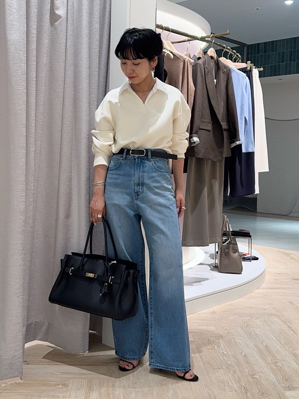 人気の襟つきダンボールプルオーバーを デニムと合わせました✨ 襟付きで、サラッとした素材感なので デニムと合わせてもきれいめな印象をキープ! 大きめバッグをアクセントに👜 カットソーは身幅はゆったりめ、 前後差はありますが 長すぎない着丈に なっているので小柄さんにも⭕️ ボトムインせずとも着用できる長さです! スラックスのようなパンツ合わせも おすすめですし、スカート合わせも! 同素材のフレアスカート、タイトスカートと セットアップ着用も可能です☺️ tops:ワンサイズ pants:XSサイズ
