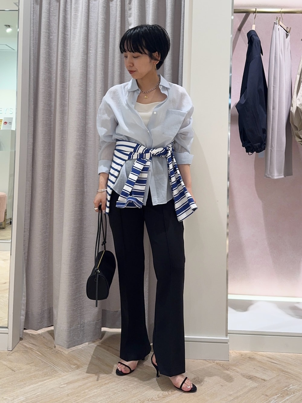 今すぐ着れるシアーオーガンジーシャツ! シャツ×パンツのシンプルな コーディネートに ボーダーカットソーを腰巻きしてアクセントに✨ シャツは程よい透け感があり、 一枚ではもちろん、羽織にもおすすめ! サイズ感が大きすぎないことで きれいめなアイテムとの相性も⭕️ パンツは人気のスリットパンツ! 後ろにスリットが入っていて 後ろ姿も映えるパンです☺️ センタープレス入りで 楽ちんなジョーゼット素材ながらも 綺麗見えします。 154cmで36サイズを着用して 着丈がちょうどいいくらいでした! 骨格ウェーブなので腰回りのサイズもジャストでした! シアーに合わせて ネックレスも透明感のあるものをチョイスしています🤍 shirt:38サイズ tops:ワンサイズ inner:36サイズ pants:36サイズ