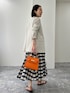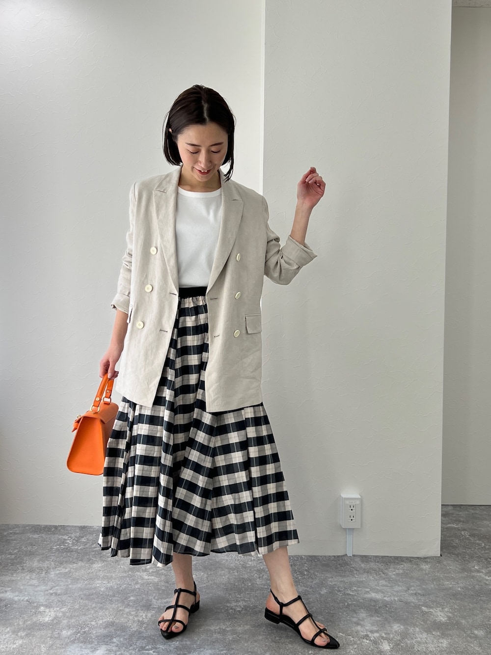 ジャケットスタイル シンプルジャケットもチェックスカート合わせで甘さ控えめな印象にスタイリングしました。 オレンジバックもアクセントになるのでおすすめです。