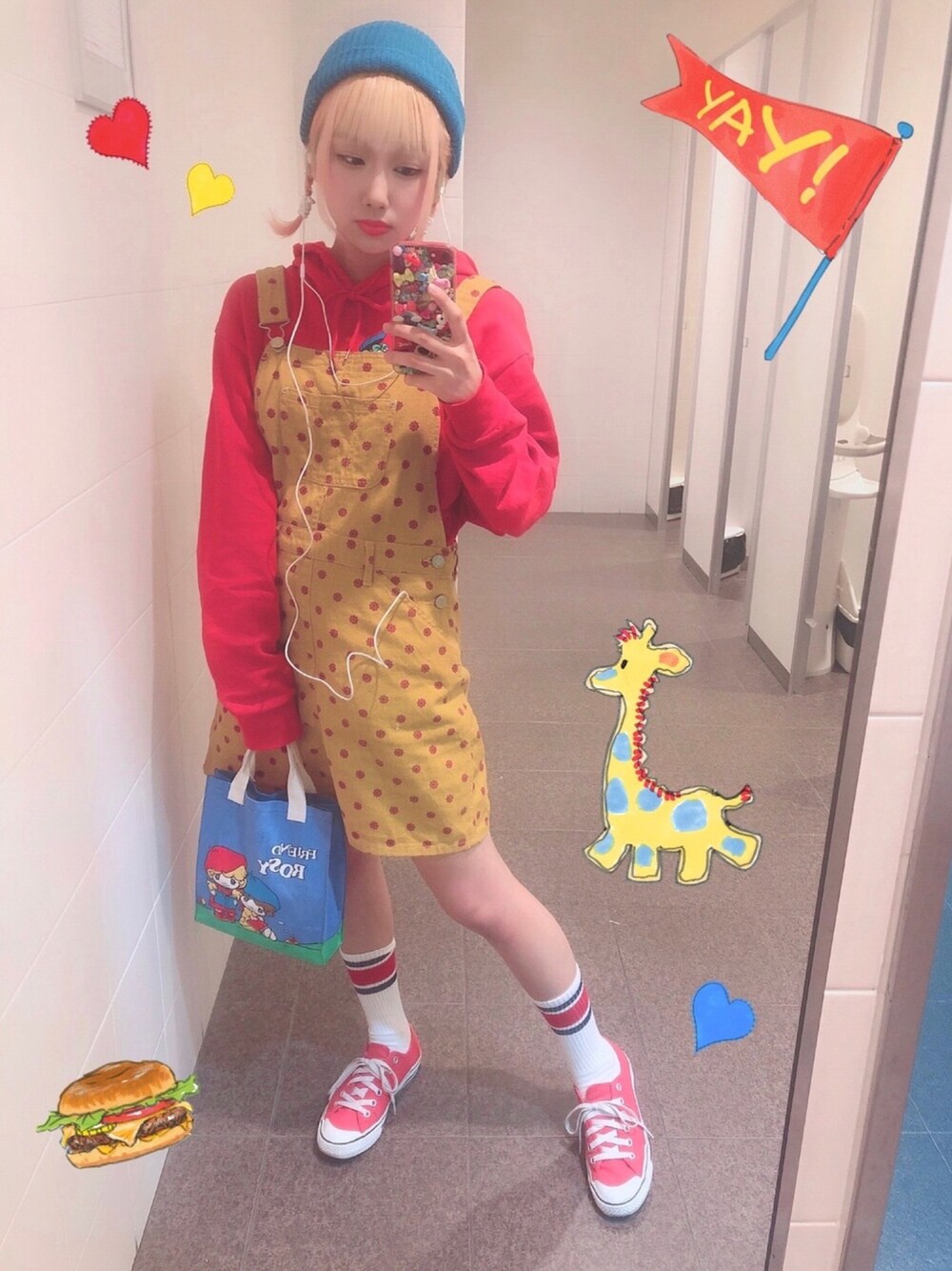 スニーカーはしょうがないとして、 くつしたは白生地にみどりor青ラインのハイソックスが履きたかった。無かった 、、 その結果 赤がくどい感じに(>_>) この日は近所のお友だちと夜ごはん🍣 急いでたのもあってシンプルコーデになりました! このトートバッグ、 ちっさいのにほんまによう入る👜📱👛👓💄🔑 手に持つタイプのかばんあんまり好きじゃなかったけど、これは使いやすいです。 P.S. トイレで撮ってるのに食べもののスタンプ貼るのはどうかと思う