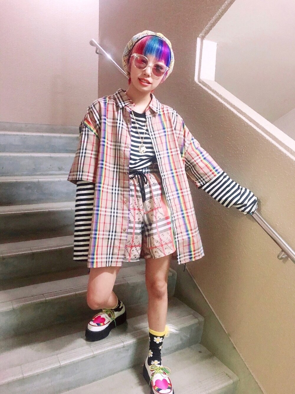 🦄💖🏁🌈 MY STYLE SETUP 🦄💖🏁🌈 インナー:たぶんSPINSS シャツ、ボトム:VOLCAN&APHRODITE くつした:Troll Socks シューズ:YOSUKE 帽子:ホンワカパッパ インナーを白黒にすると、柄×柄でもまとまって見えますー😆🏁(くつしたも合わせました) 髪をベレー帽に全部入れて、ショートカット風に。 シンプル×レインボーも可愛いね🌈