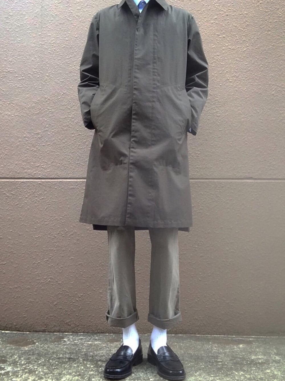 Uniqlo UのブロックテックコートとオックスフォードシャツとBanana Republicの古着チノにHARUTAの本革ローファー この色のコート探し回ってやっと見つけました。長くて使い勝手◯