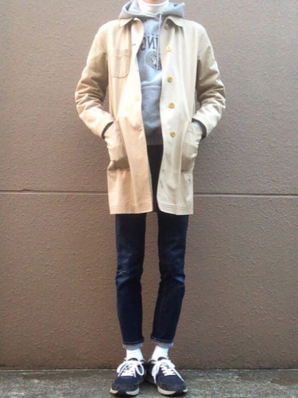 古着COLINA de passarosのステンカラーコートとChampionのカレッジパーカー、GUのタートルネックシャツ、UniqloのリジットデニムにNew Balance880 パーカー×コートの組み合わせ、鉄板ですね。今はNew Balance993が欲しい…
