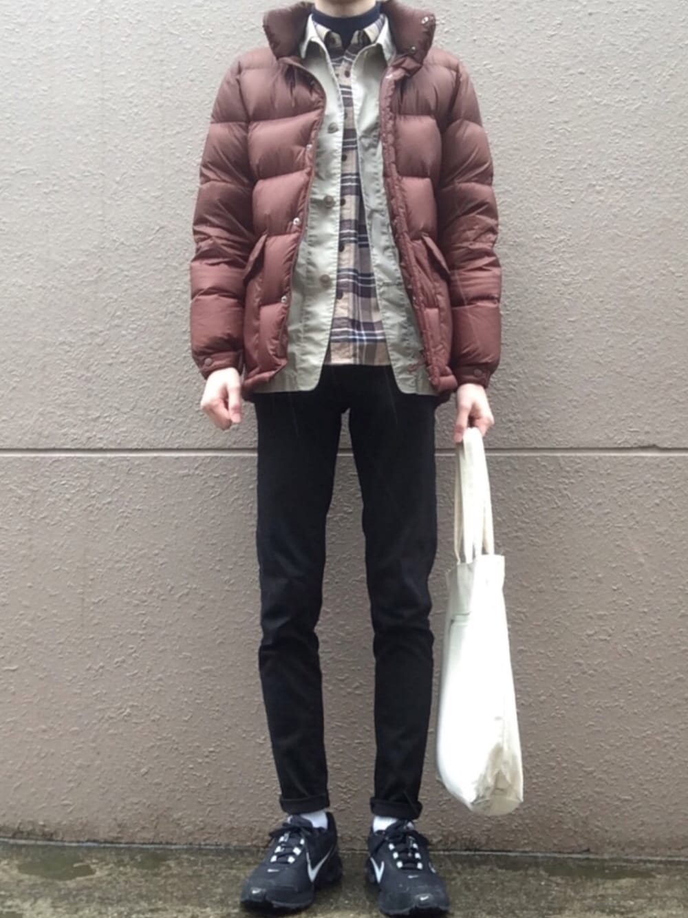 Uniqloダウンとジャケット、タートルネックシャツ、GUのチェックシャツ、Uniqloの黒スキニーにNike Air torch3。バッグは本屋さんで買ったトート 外みたら雪!雪はさすがにダウンジャケット(笑) 今日はダウンを脱いでもジャケットがあるので屋内でもバッチリ。