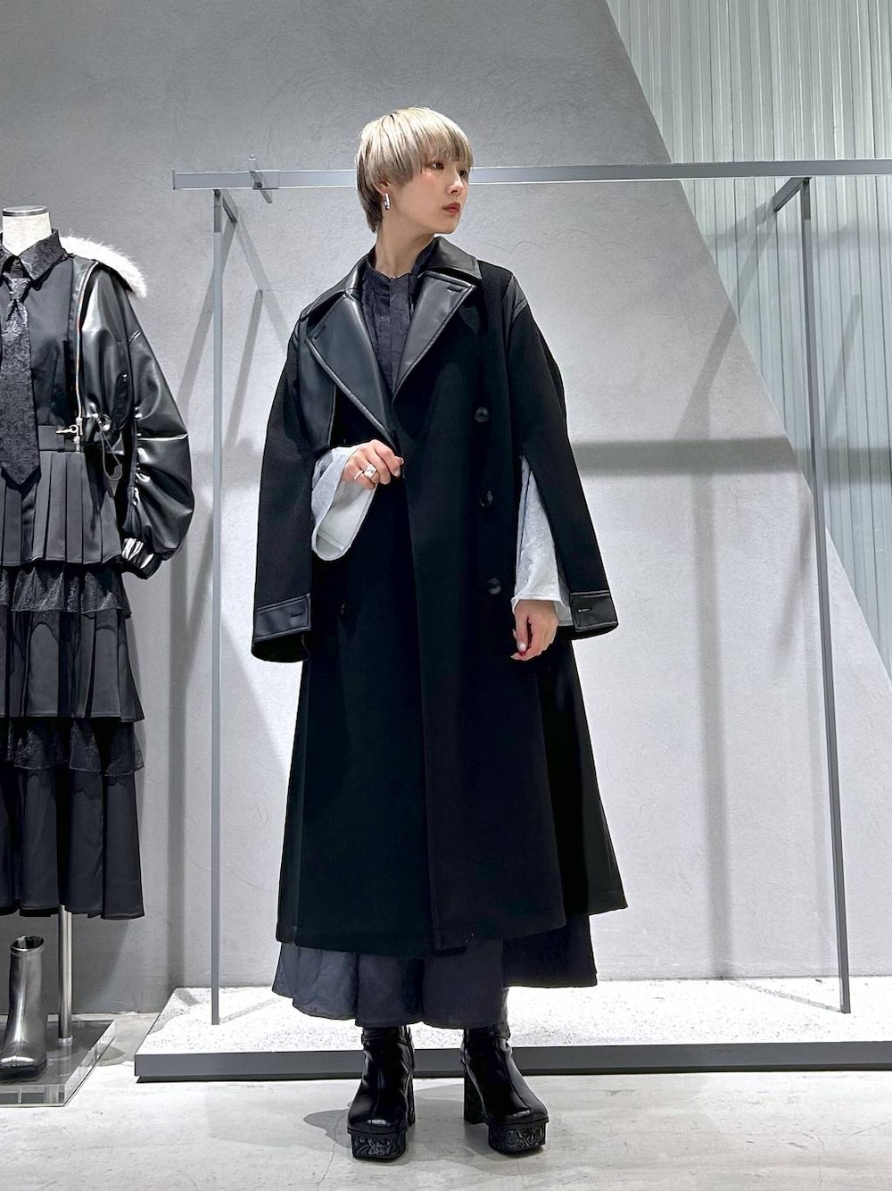 Mone(HAREヘップファイブ)のチェスターコート「ウーリーテックフェイクレザーキリカエトレンチコート(HARE)」を使ったコーディネート
