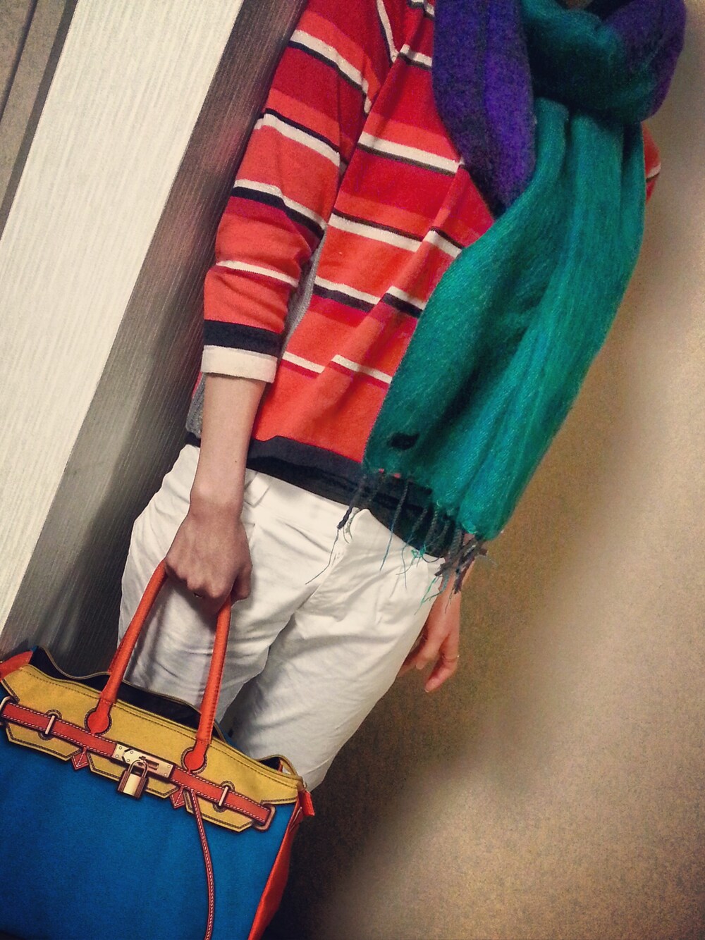 オレンジ系のニット/セーター、ブルー系のトートバッグ、ブラック系のメガネを着用したレディースの春コーディネートの1枚目の写真