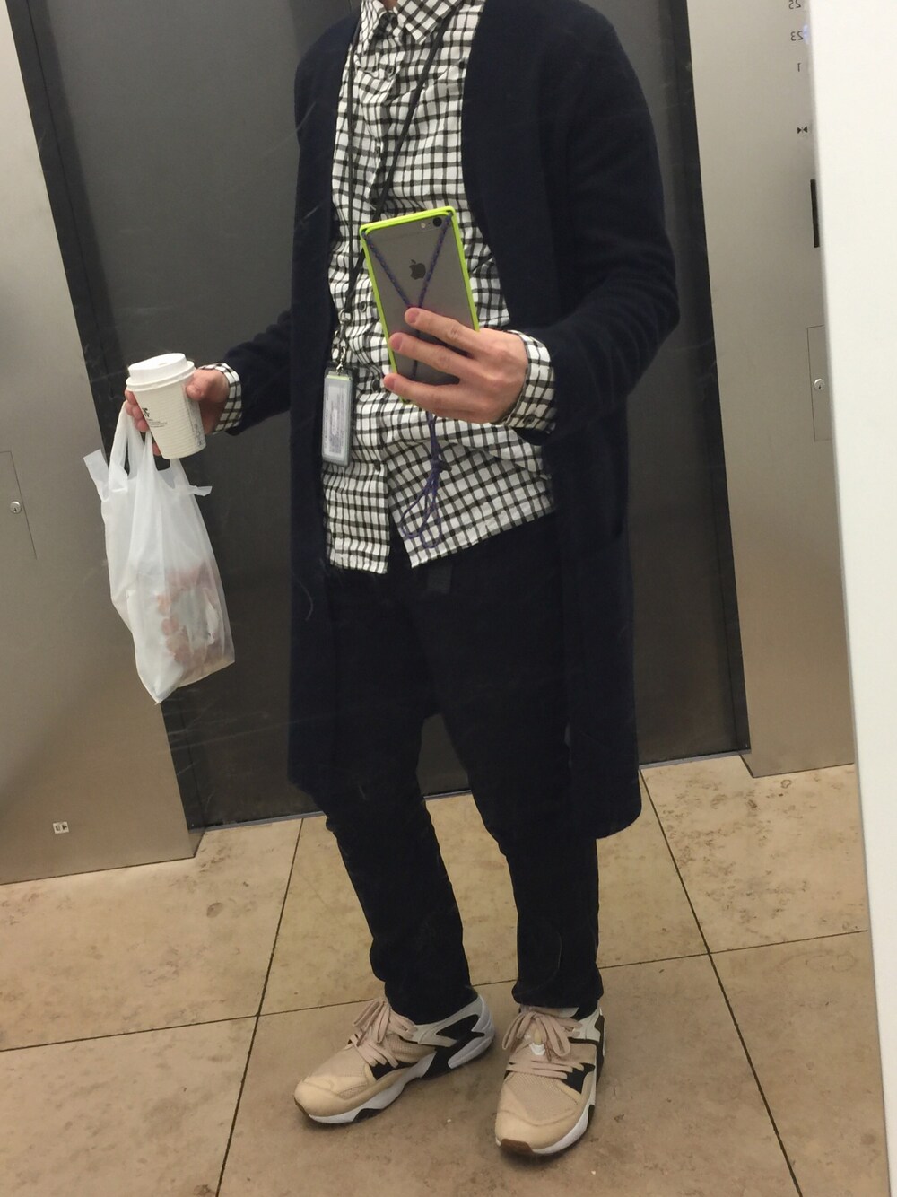 丈の長いノーカラーカーディガンがメンズでは少ないのでUNIQLO×LEMAIREのレデイースで良いのを見つけた。深夜残業のリラックススタイル