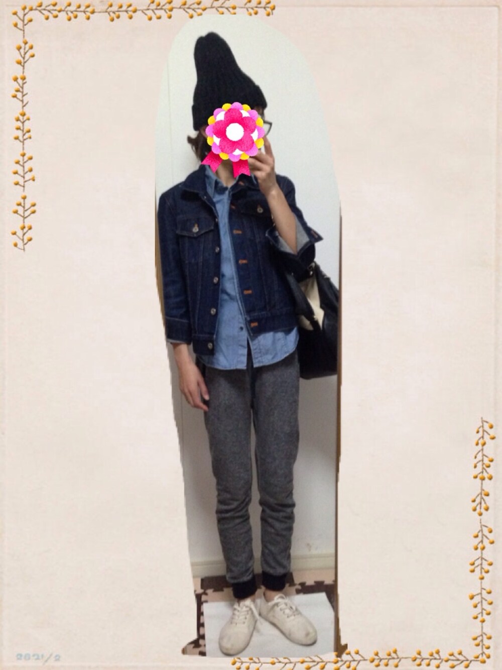 桜、きれいだった(*^^*) けど…くしゃみは止まらず。 花粉辛すぎる(>_<) ニット帽・パンツ・靴・GU シャツ・デニムジャケット・古着 バッグ・Heather