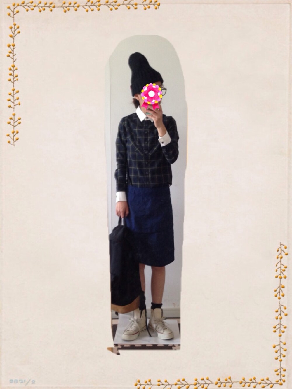 ニット帽・GU シャツ・haco. スカート・古着 スニーカー・コンバース