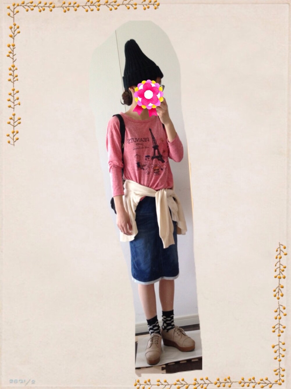 ニット帽・GU ロンT・古着 スカート・Azul moussy 靴・Heather リュック・MUJI スヌーピーのロンTは古着屋さんで一目惚れ☆ 毎日…ニット帽(^^;;