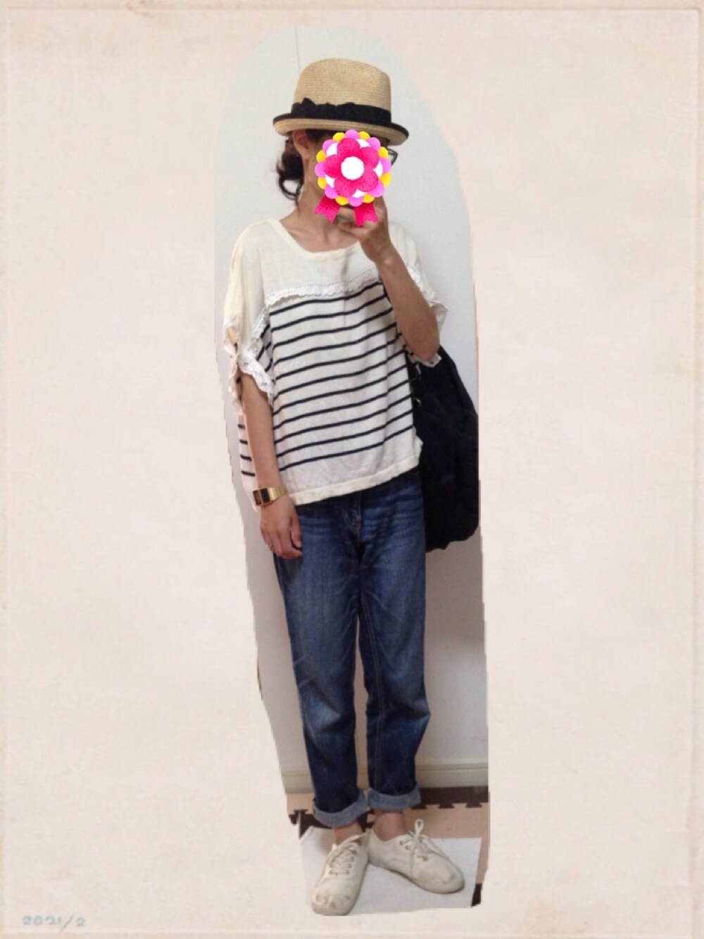 ニット・PAGEBOY デニム・haco. スニーカー・GU 麦わら帽子・? 鞄・Heather