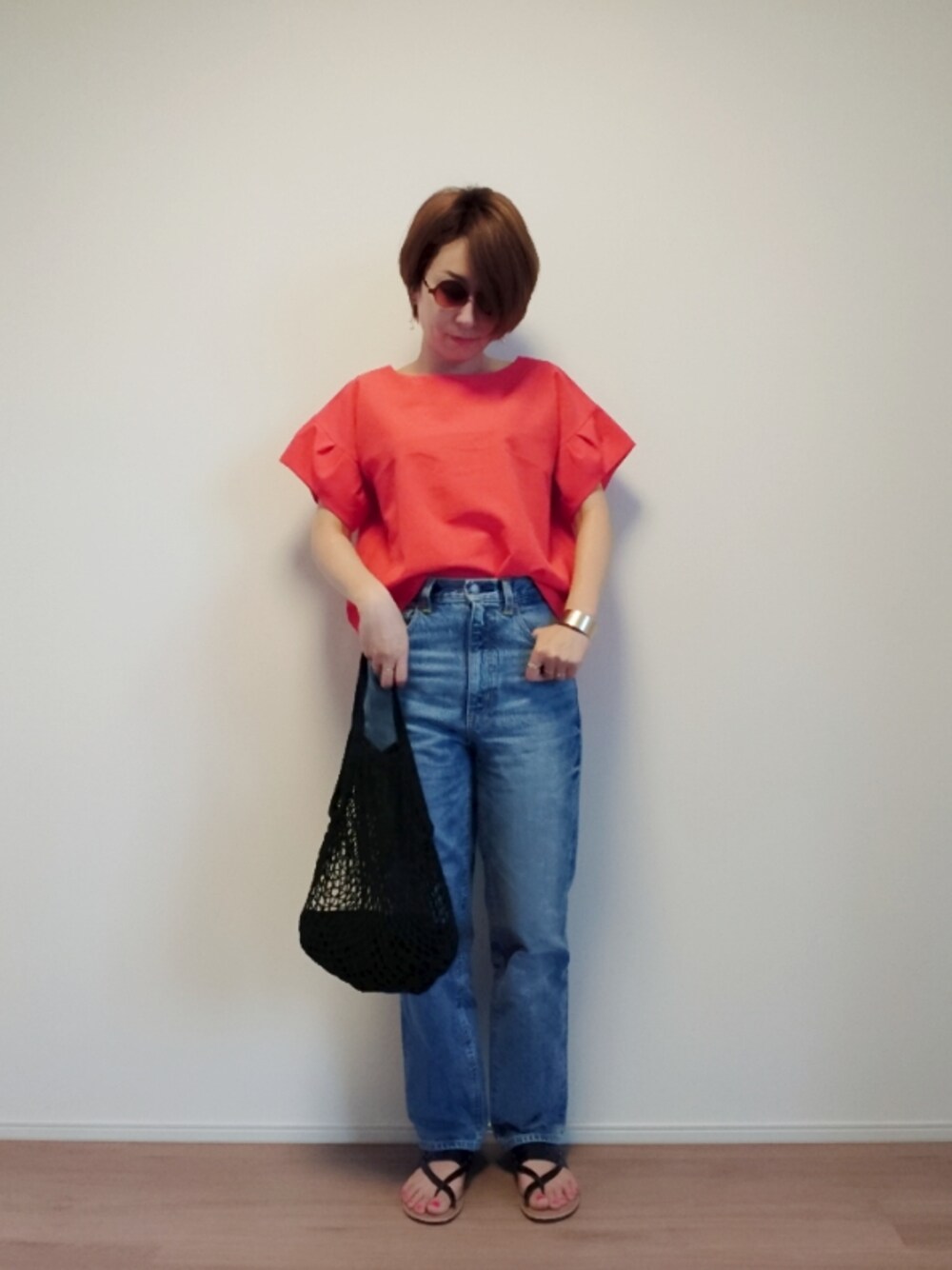 ご覧いただき、ありがとうございます✨ 赤のブラウスが主役🐥❤️ アクセサリーはゴールド系で統一✋