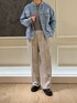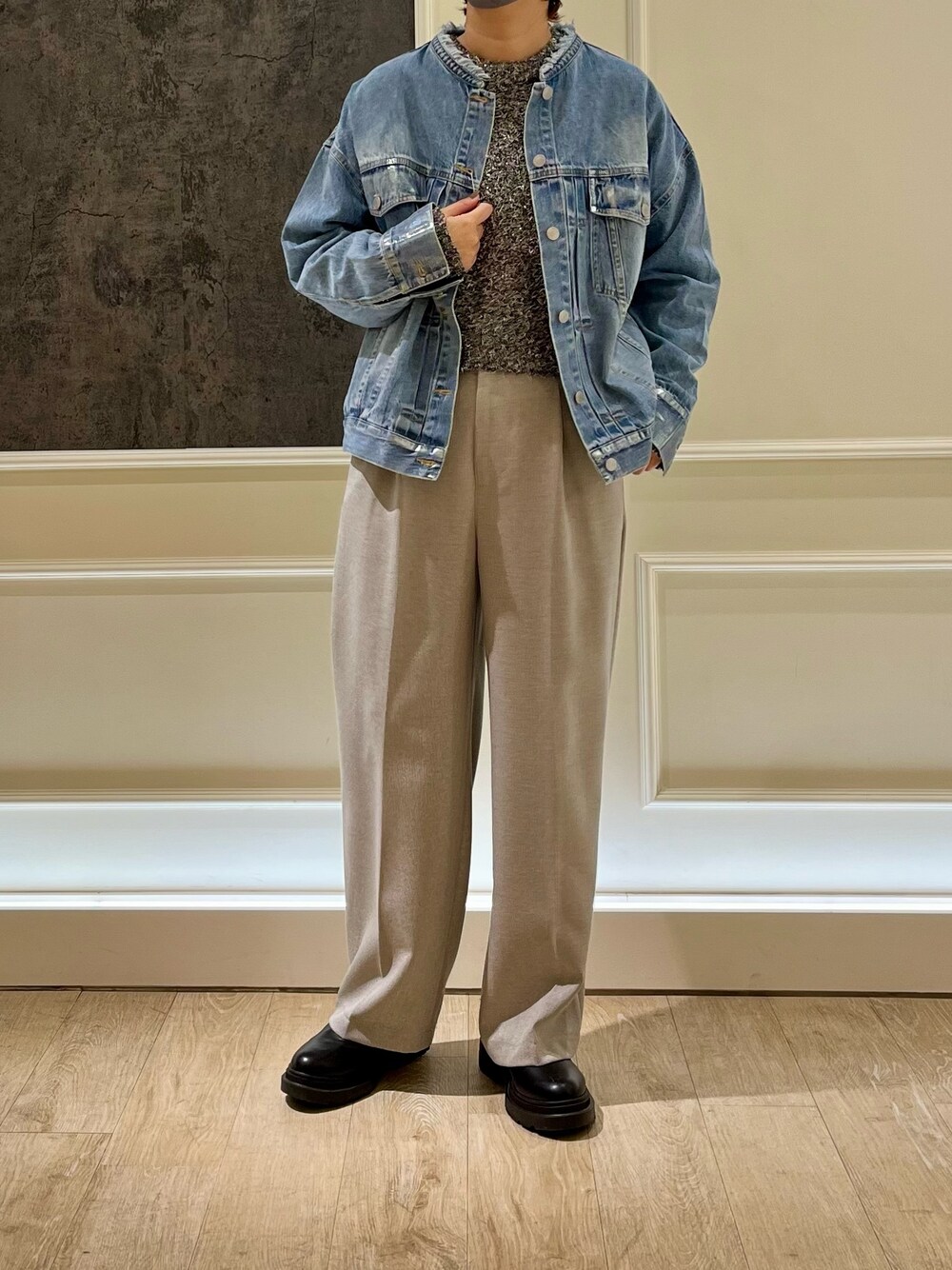 デニムのジャケットはノーカラーなのでカジュアルになりすぎなくて便利です! スラックス合わせでキレイめカジュアルに!