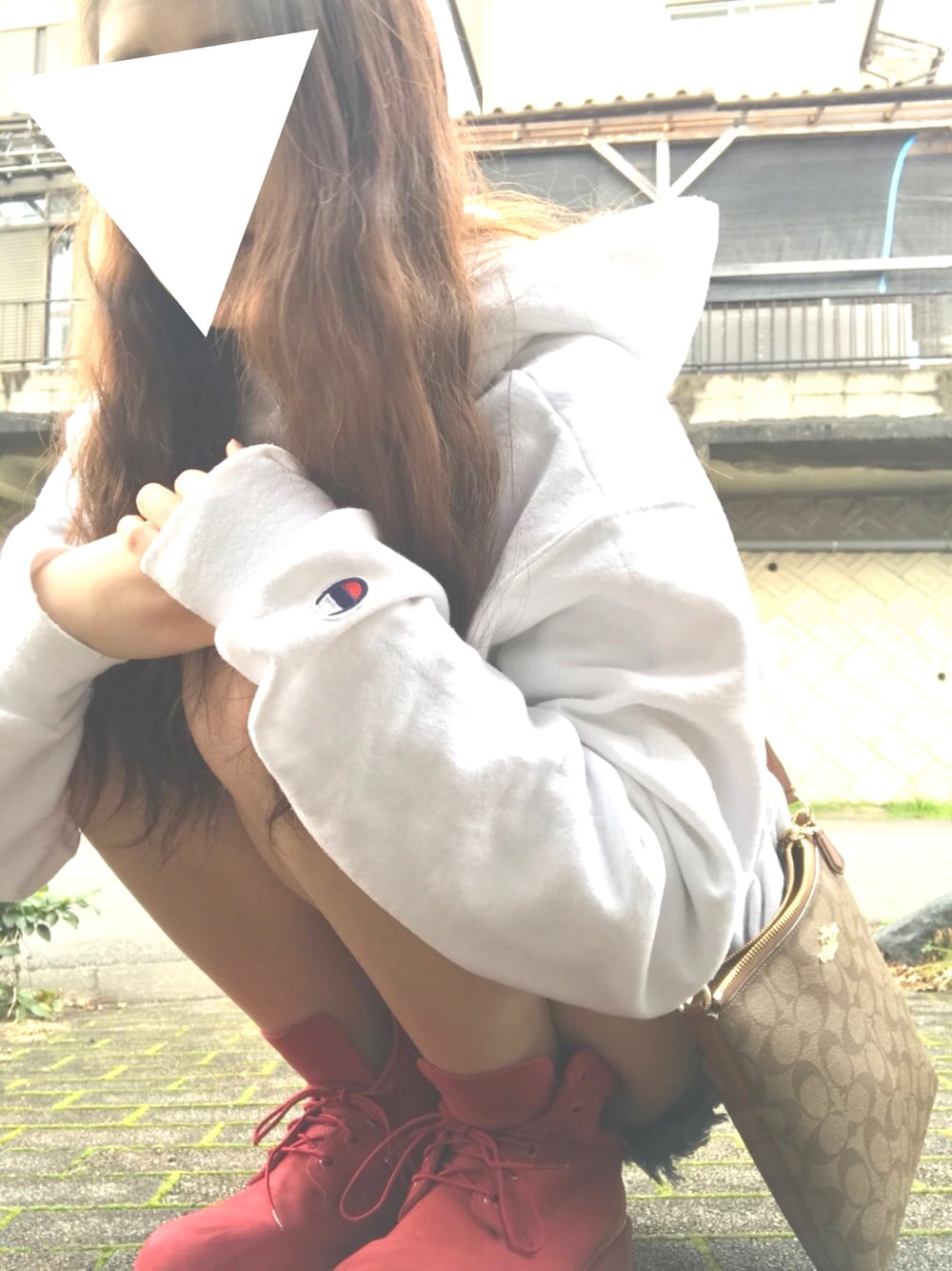 大きめのパーカーをワンピース風に! トップスは白でシンプルなので、赤のティンバーを合わせてバランスよくしました😊