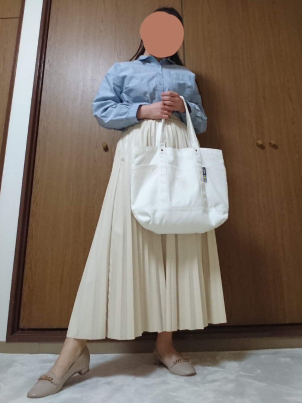 水色と白の組み合わせけっこう好きです!!!春っぽくなってますか、ね??🌱 サマンサモスモスのこのシャツ、サックスブルーがとてもとてもいいお色なんです。。。🥺軽めの合皮プリーツスカートとの相性も良いかんじです。プチプラのあやさんのスカートはポケット付きなので使い勝手も抜群です♪* こちらのパンプスは、本当歩きやすい👠💕