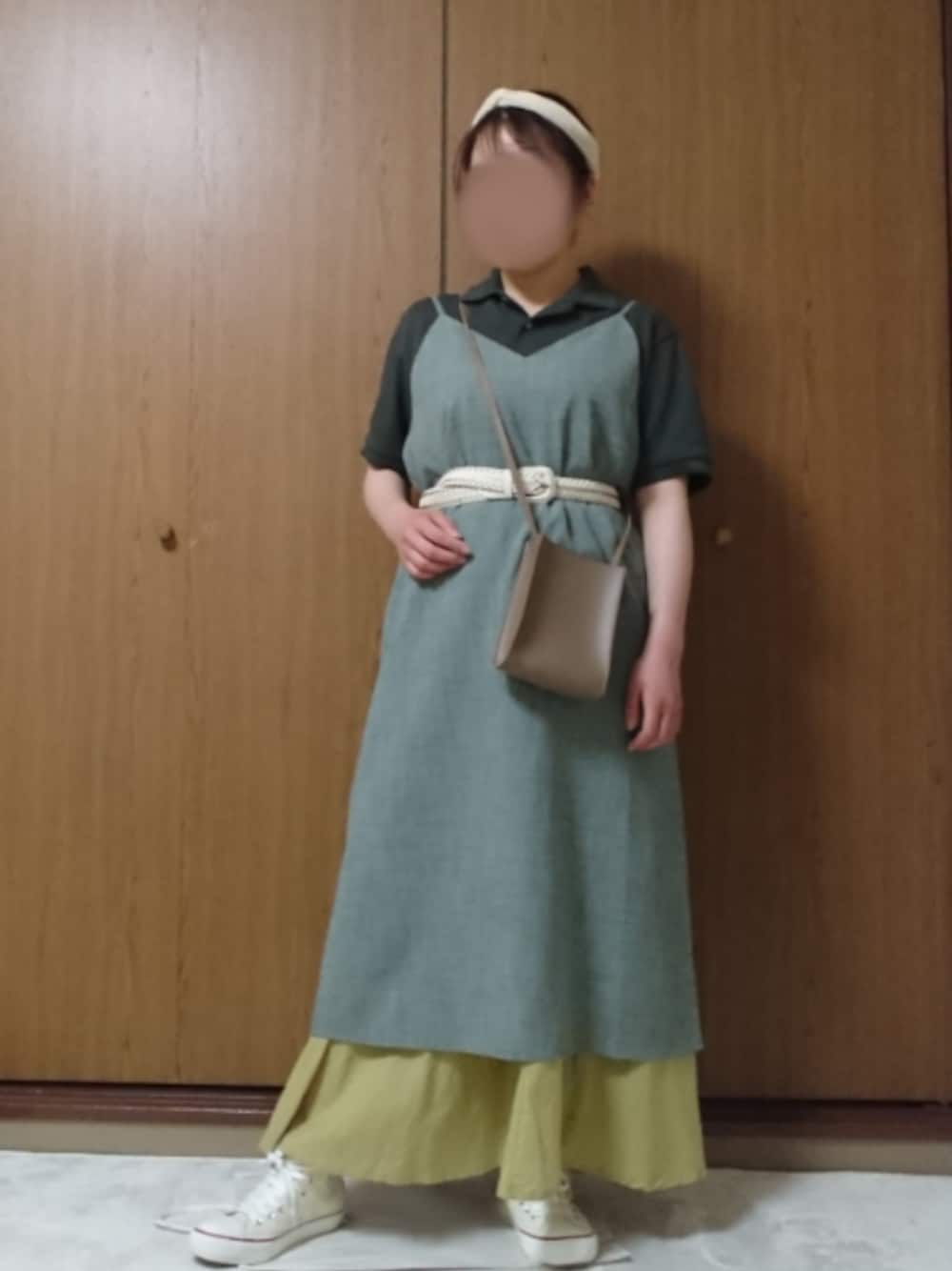 キャミワンピ、ウエストマークすると雰囲気変わる🌼🍃 気づけばまた…お得意のオールグリーンになってました😲💦そして、な~んかこのコーデ、古民家を改装したカフェ☕にいる店員さんと似てるんよなぁと考えてたんですが…たぶんキャミワンピがエプロンの雰囲気と似てるんかも🤣