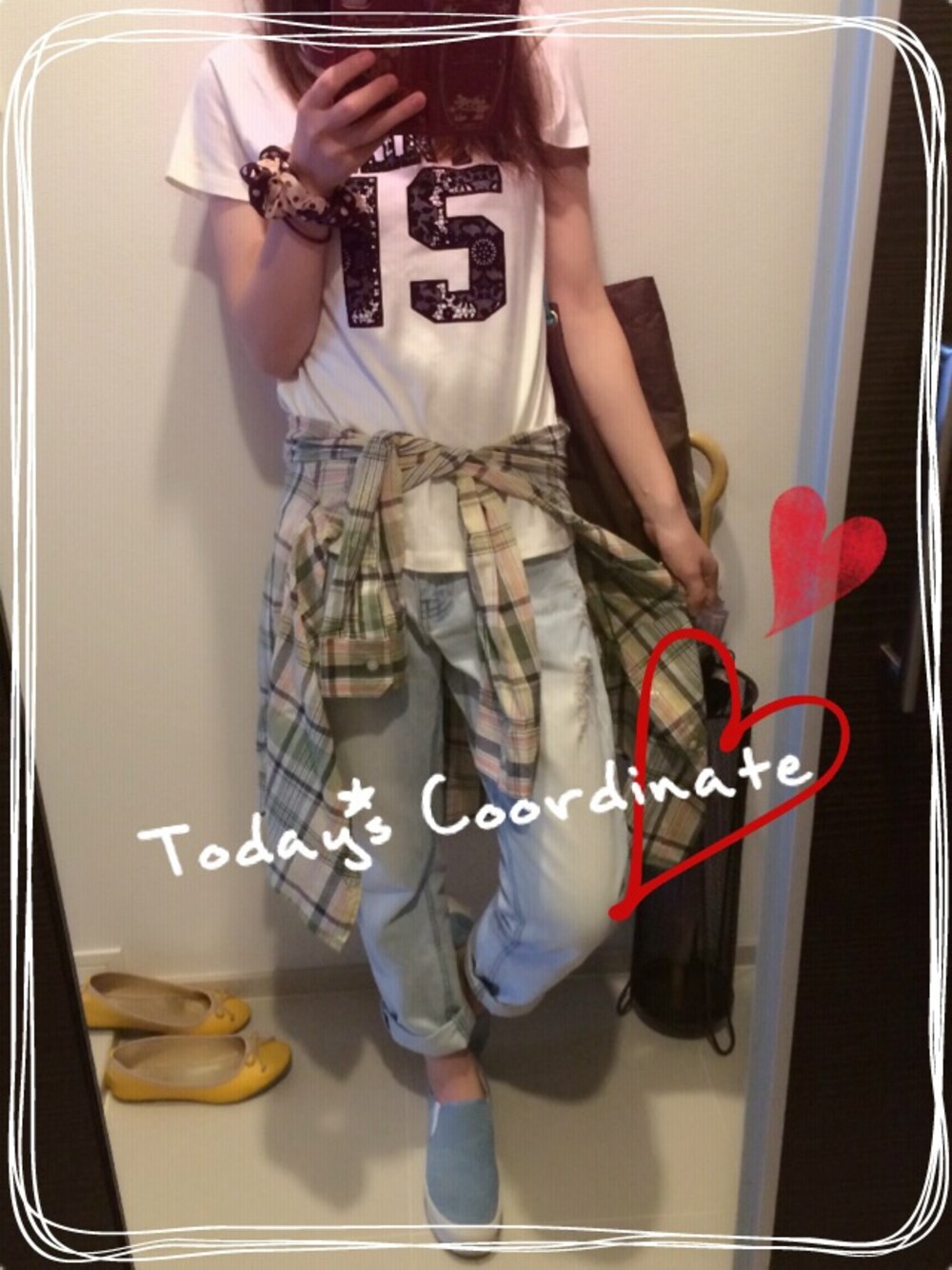 今日の出勤コーデ〜♪ Tシャツの文字がレース調の 花柄になってるのがお気に入り(ฅ'ω'ฅ)♪ カジュアル感強めなコーデです。
